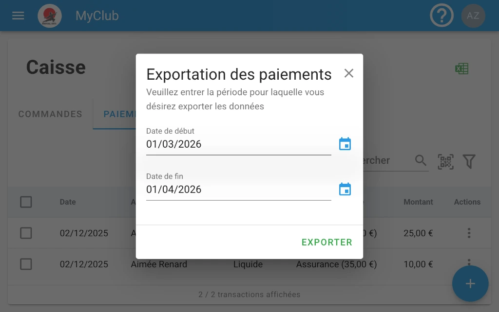 Export des commandes et des paiements au format Excel.